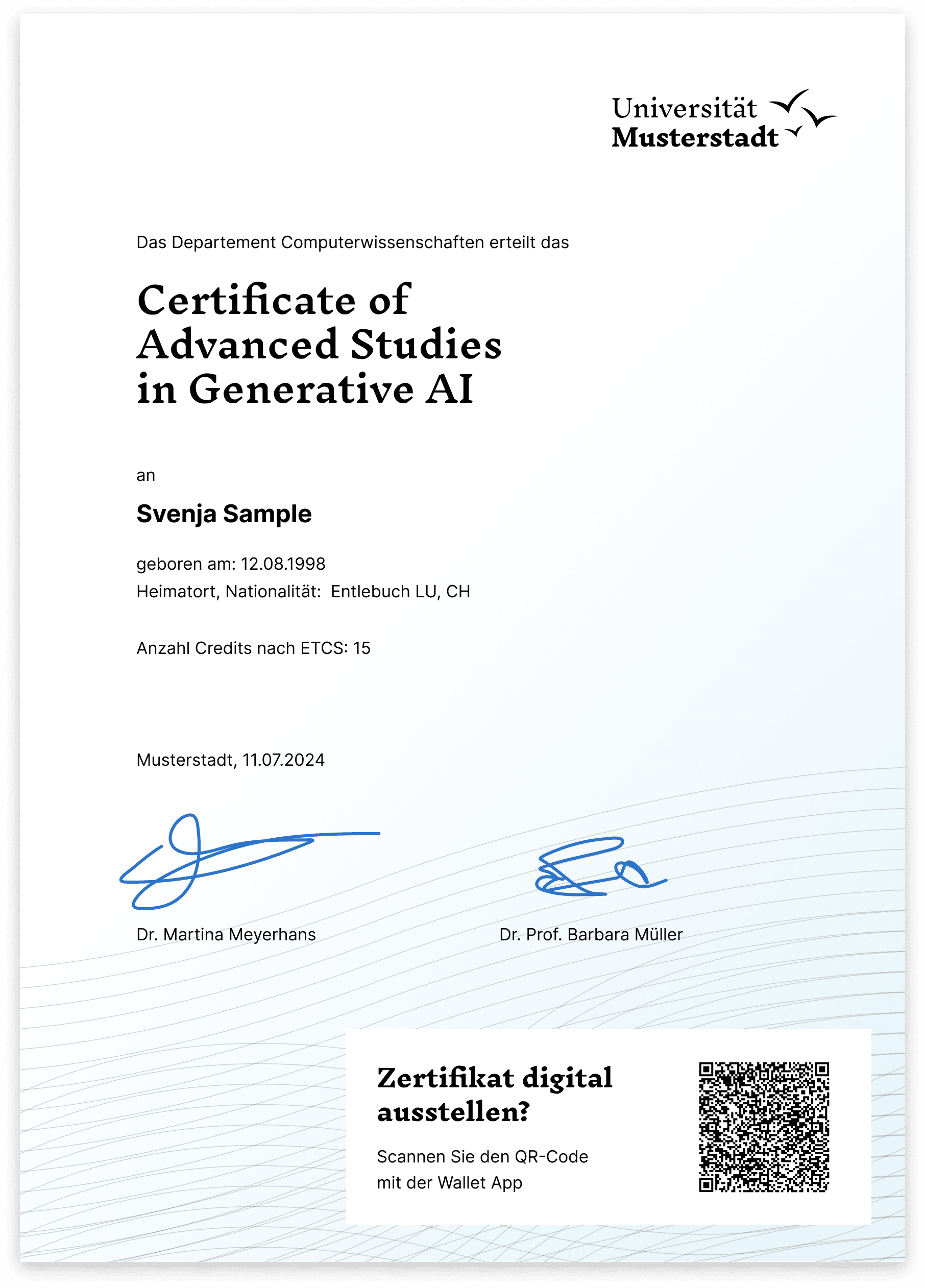 With the QR code on the printed certificate and her university login, Svenja can have the CAS certificate issued as digital proof in the Wallet app.